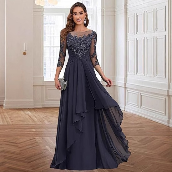 欧米のタキシードのレースの長いタイプ2025年の春の袖の低い丸首のシフォンの速売はアマゾンのワンピースに通じます。