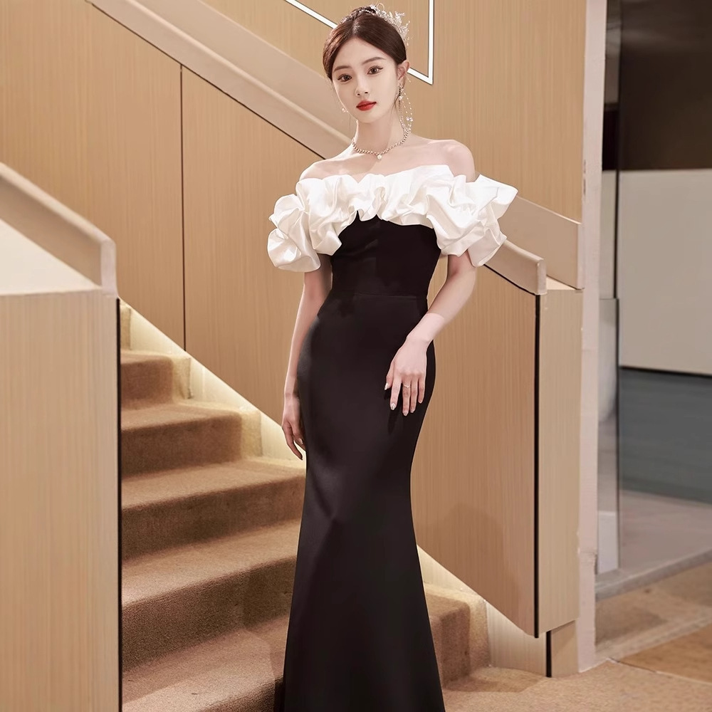 黒の新しいワンショルダーイブニングドレス、フィッシュテールウエスト痩身ドレス、ロングデザイン宴会ハイエンドドレス