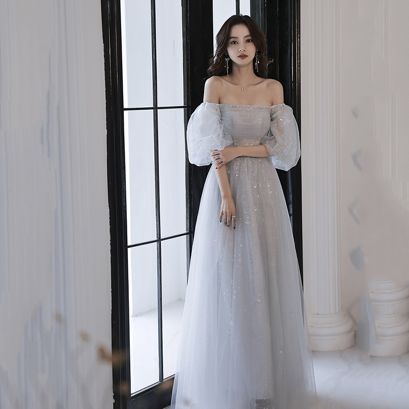芸考のタキシードの女性2024新型の春秋気質の灰色の仙気のネットの紗のワンピースの長い宴会のドレスのスカート