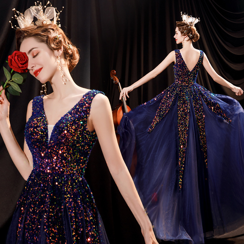 朗読大合唱公演服2024新型青い仙気星光vネックセクシー宴会司会者タキシード