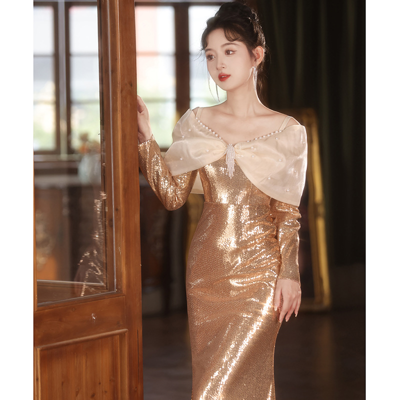高級フランス風イブニングドレス2025新作高級感春冬社交界年次パーティー気質妖精フィッシュテールドレス