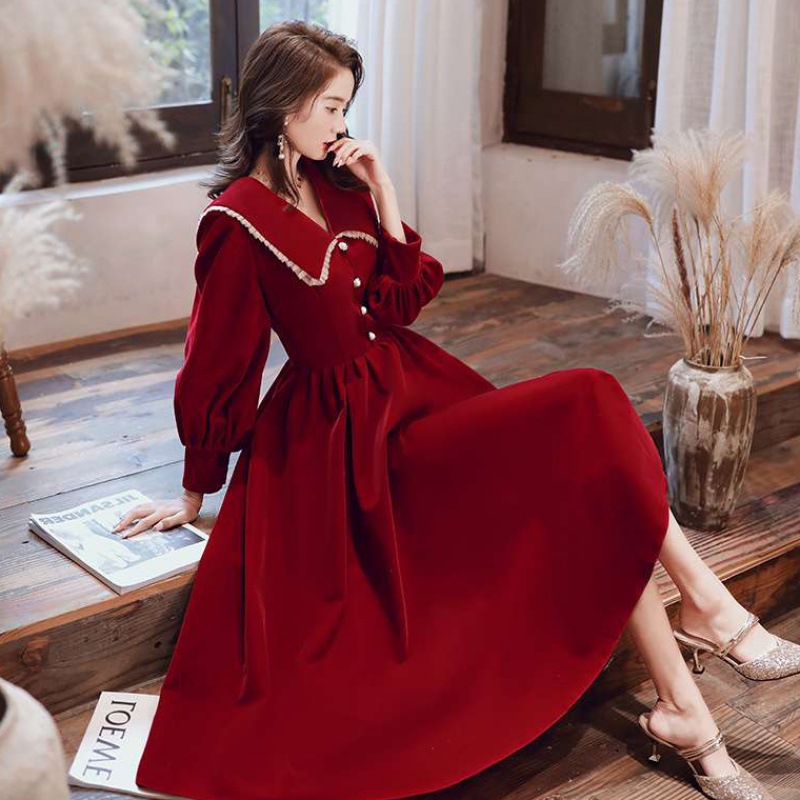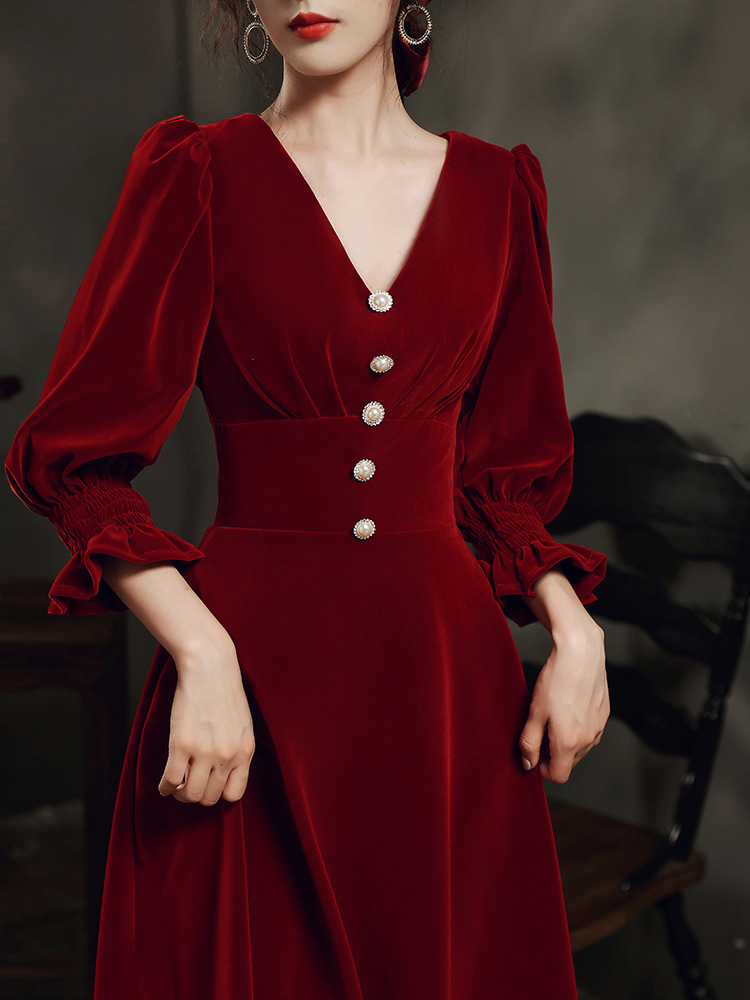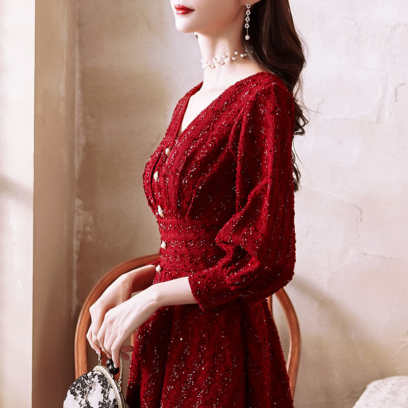 ワインレッドのドレス女性2023新夏の長袖は普段は婚約してドアに戻るワンピースの花嫁敬酒服を着ることができる