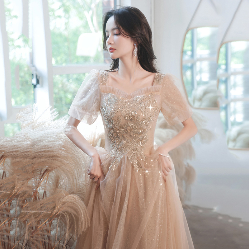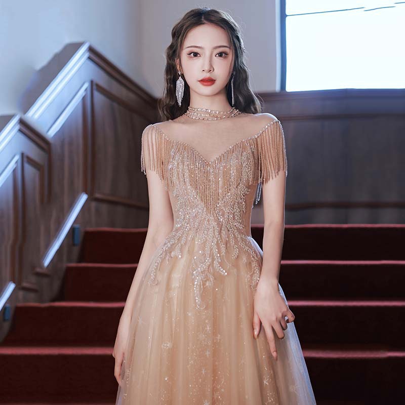シャンパン色のドレス女性宴会気質2023新型夏司会者長型卒業シーズン芸考婚約スカート