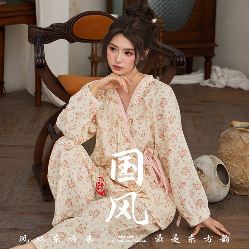 純綿二重ガーゼとパジャマの女性春と秋の薄いタイプのレトロなプリントの斜めの襟の長袖のズボンの部屋の服