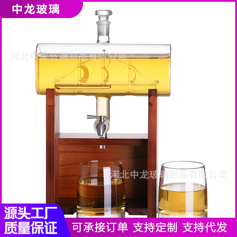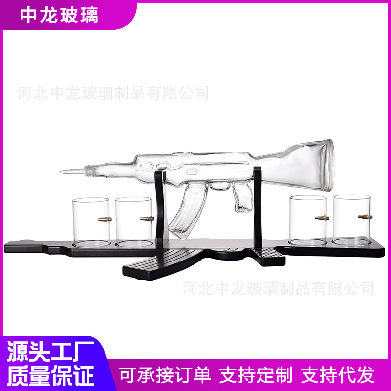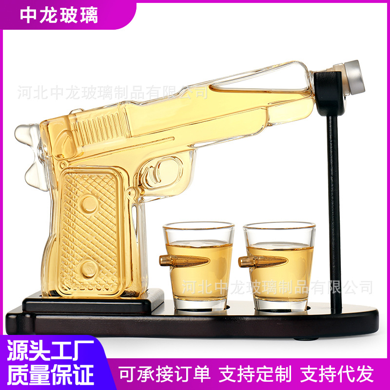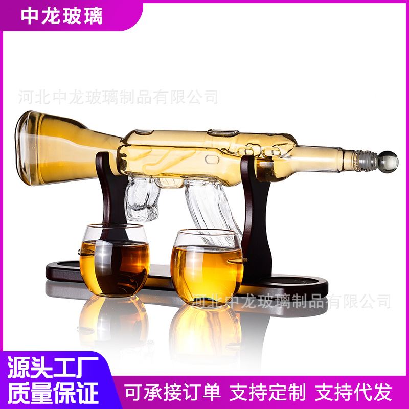 銃型の木の棚の大きい銃の酒の瓶の高ホウ素のシリコンのガラスの酒の瓶は杯の酒の器具のセットのデキャンタの酒の瓶の杯を持ちます。