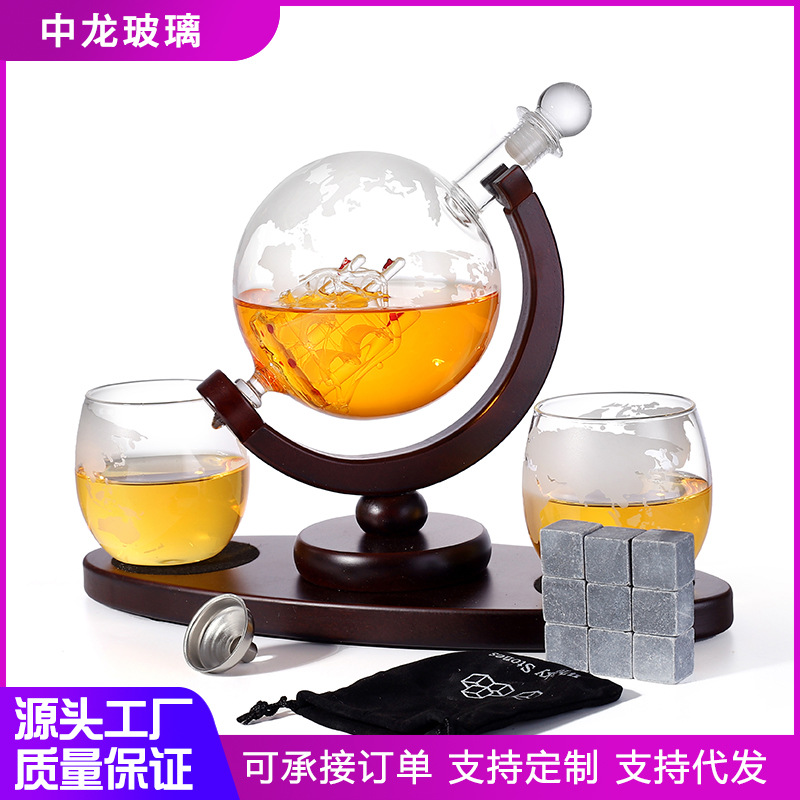 波浪型木架酒具套装 热卖盛酒器地球仪形状酒瓶带酒杯套装