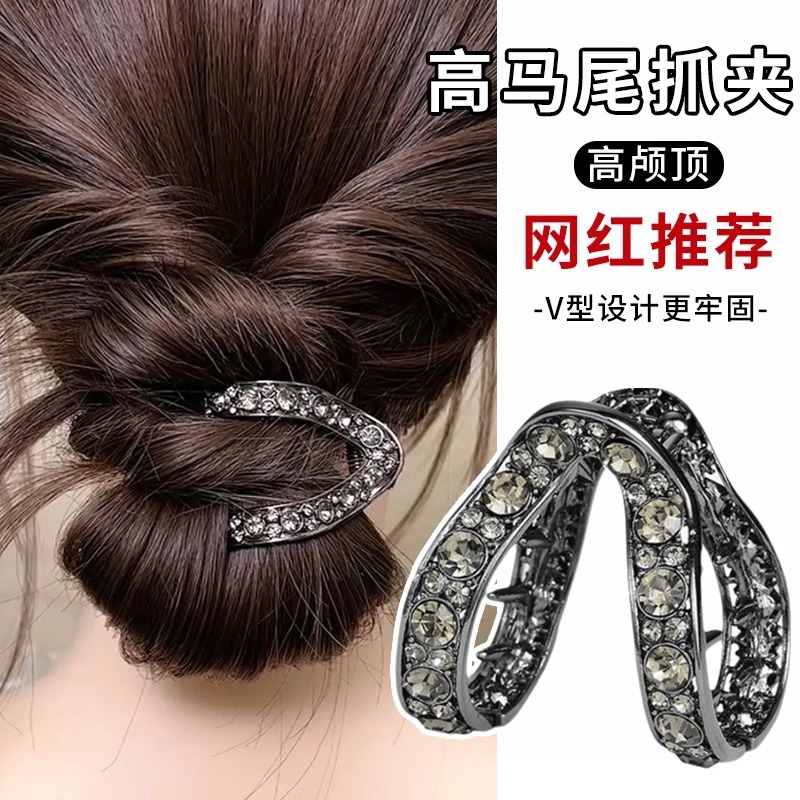 ハイポニーテールV字型グリッパー固定アーティファクト後頭部ボールヘアクリップハイエンドラインストーンクリップ女性用ヘッドギア