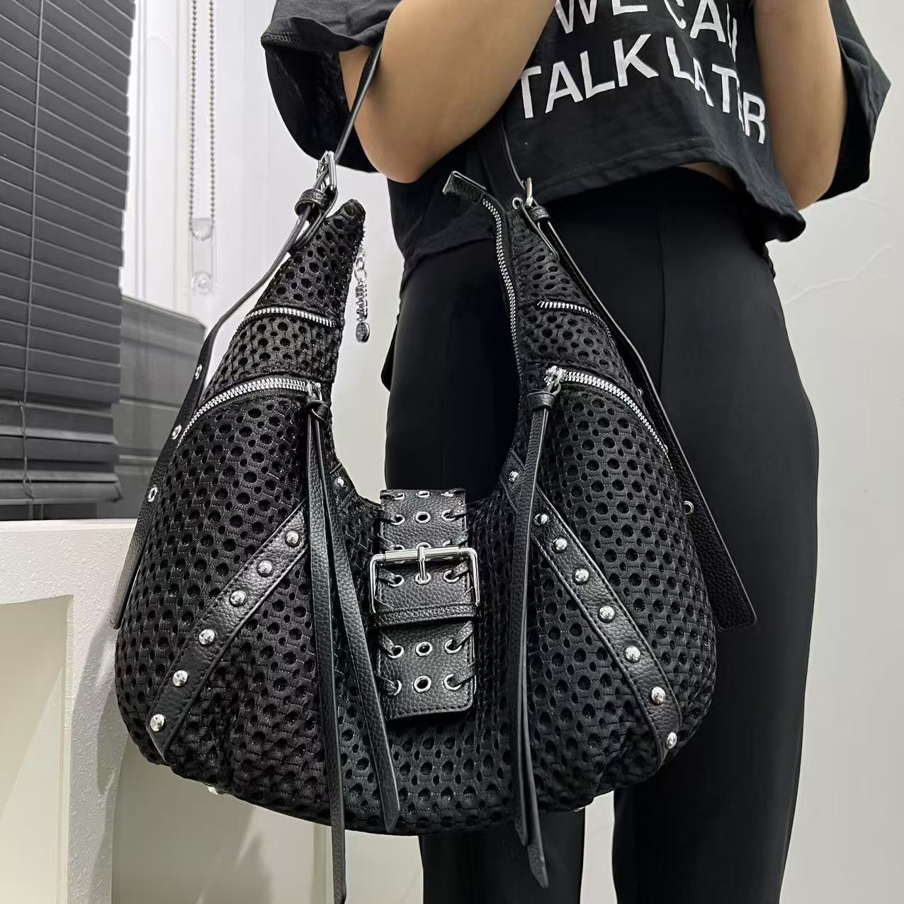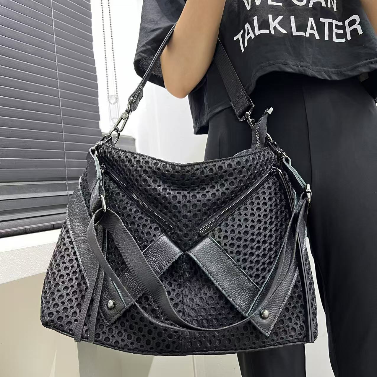 ファッションで個性的なナイロンメッシュスプライシングショルダーバッグ、大容量のレトロなY2Kストリートクロスボディバッグを提供する国境を越えた特別な供給