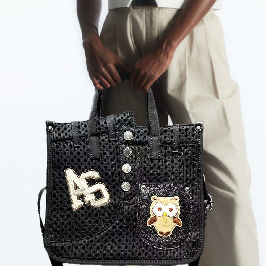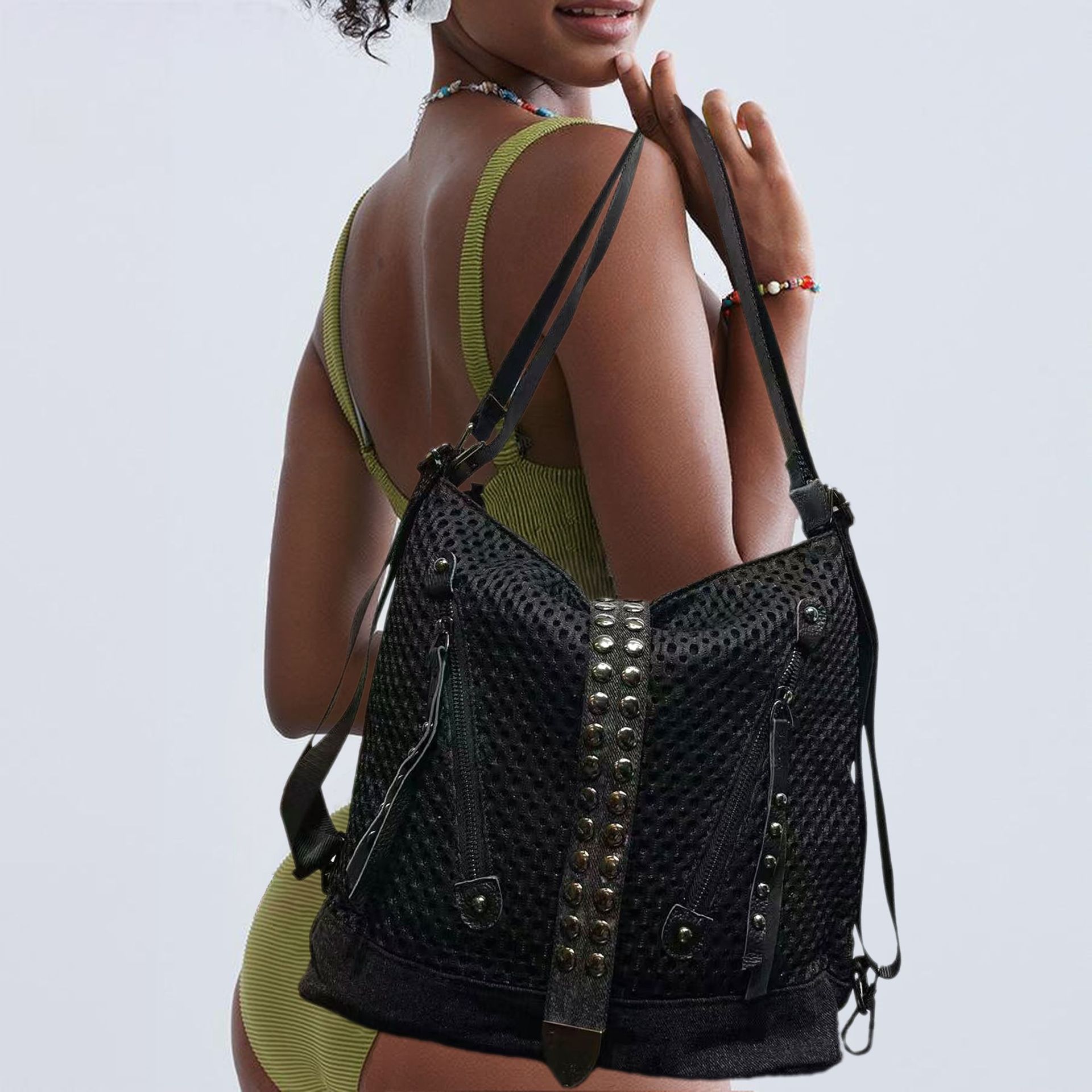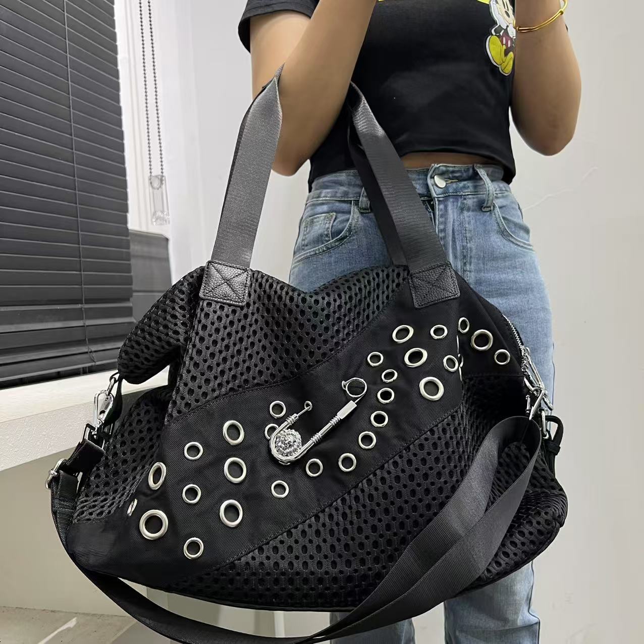 女性向けのクロスボーダー特別なファッショナブルなパーソナライズされたメッシュ特大トートバッグ、大きなピンリベットリングショルダーバッグ