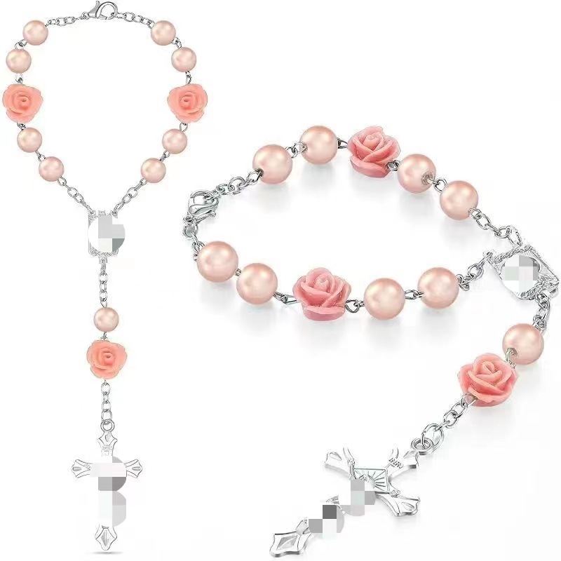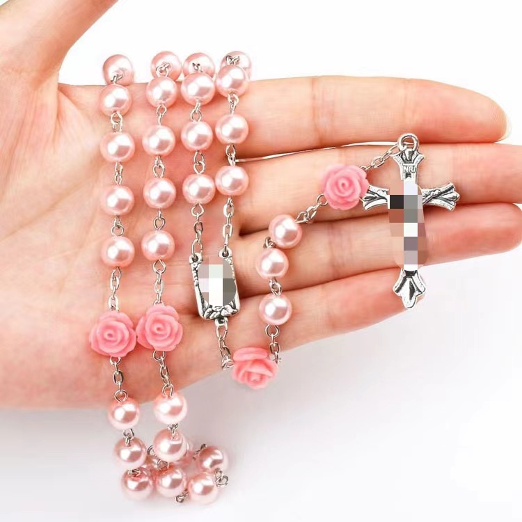 クロスボーダーのピンクの真珠のバラの花は真珠の数珠のネックレスの聖母の十字のネックレスのアマゾンの人気があります。