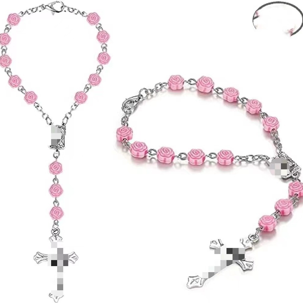 国境を越えたアマゾンの人気数珠ブレスレットピンクのバラビーズクロスブレスレット洗礼珠メーカー