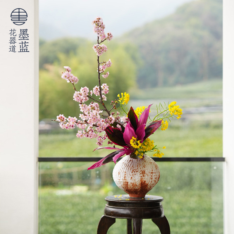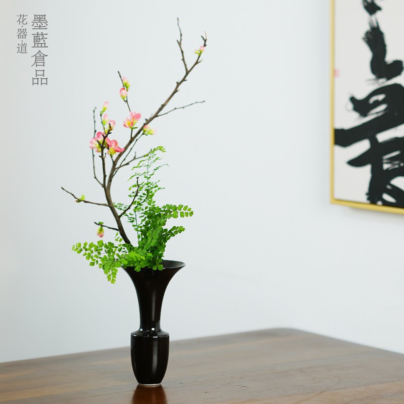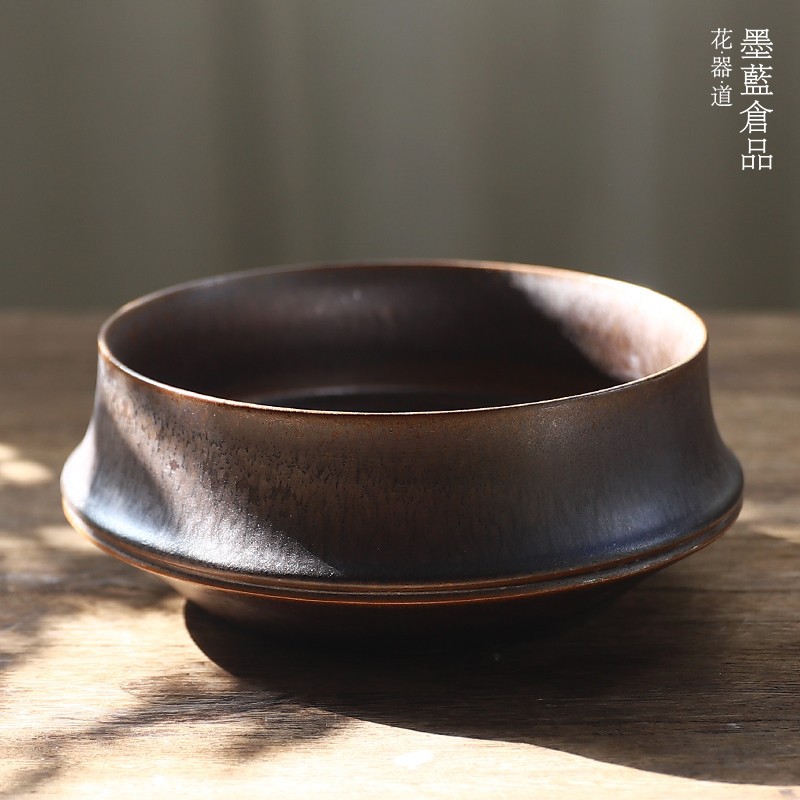 墨黒陶磁器ねじ山花器禅意レトロ中国式生け花器日本式花道花盤剣山生け花器