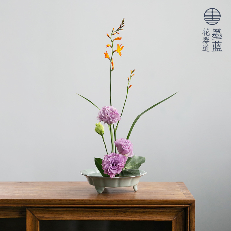 墨藍花器竹節花盤中華花芸禅意花鉢中国式日本式模造陶磁器花道生け花器