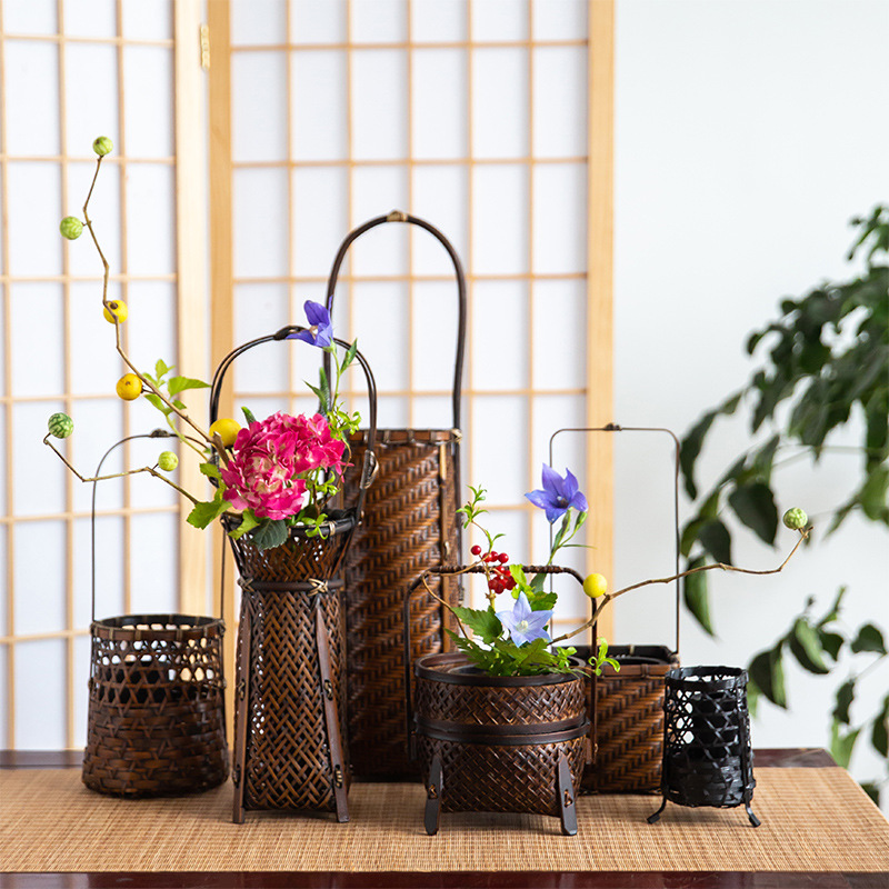 手作りの小さな花かごを飾ってかごを並べます。竹編みの花瓶の花器禅意中国式日本式生け花器の花芸かごです。
