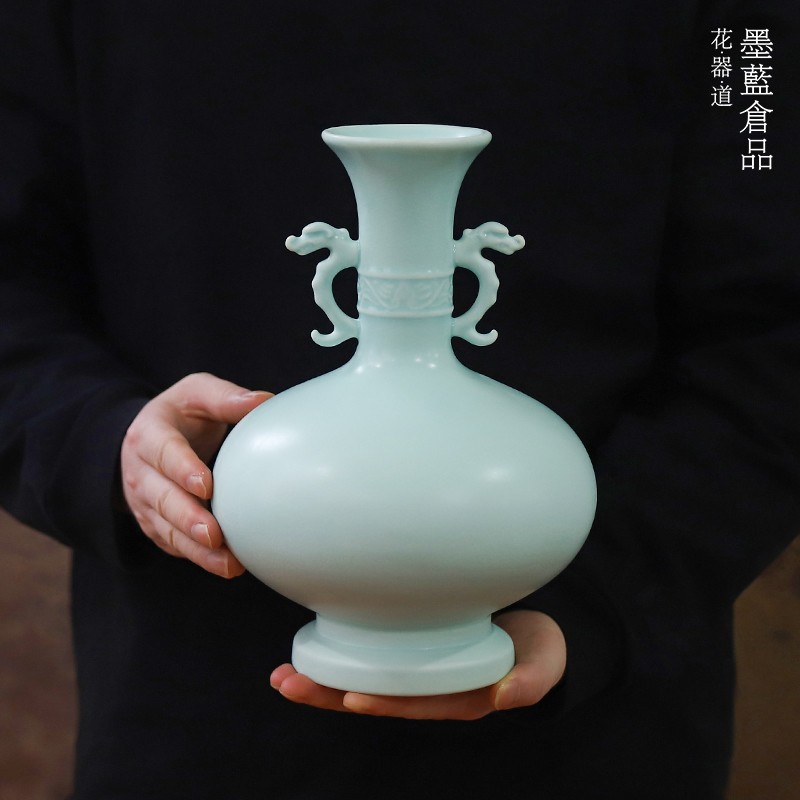 景徳鎮陶磁器客間中国式禅意復古双耳青磁挿し花瓶博古架書斎玄関置物