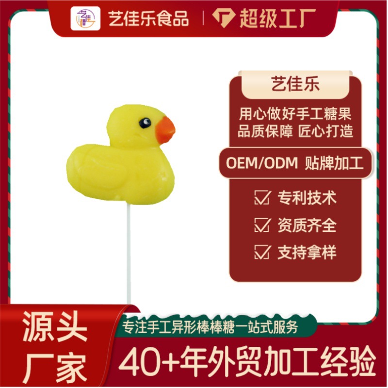 カスタマイズされた子供の日のフルーティーなキャンディスナックインターネット有名人の漫画の形の小さな黄色いアヒルのロリポップギフト
