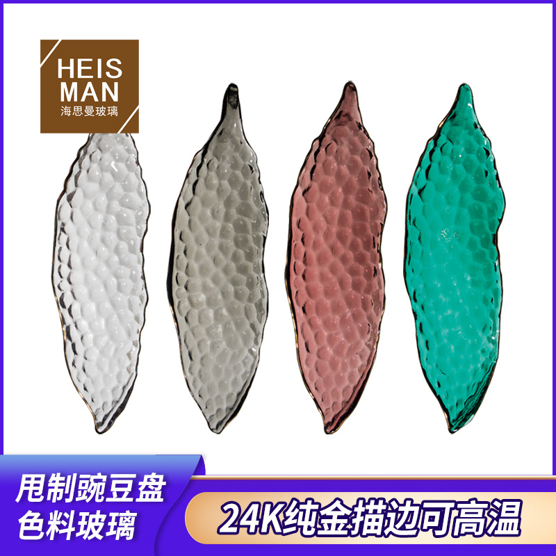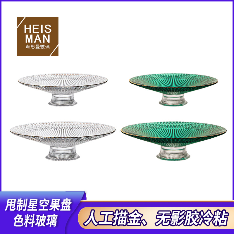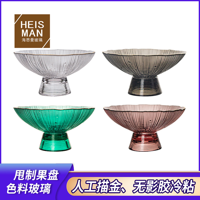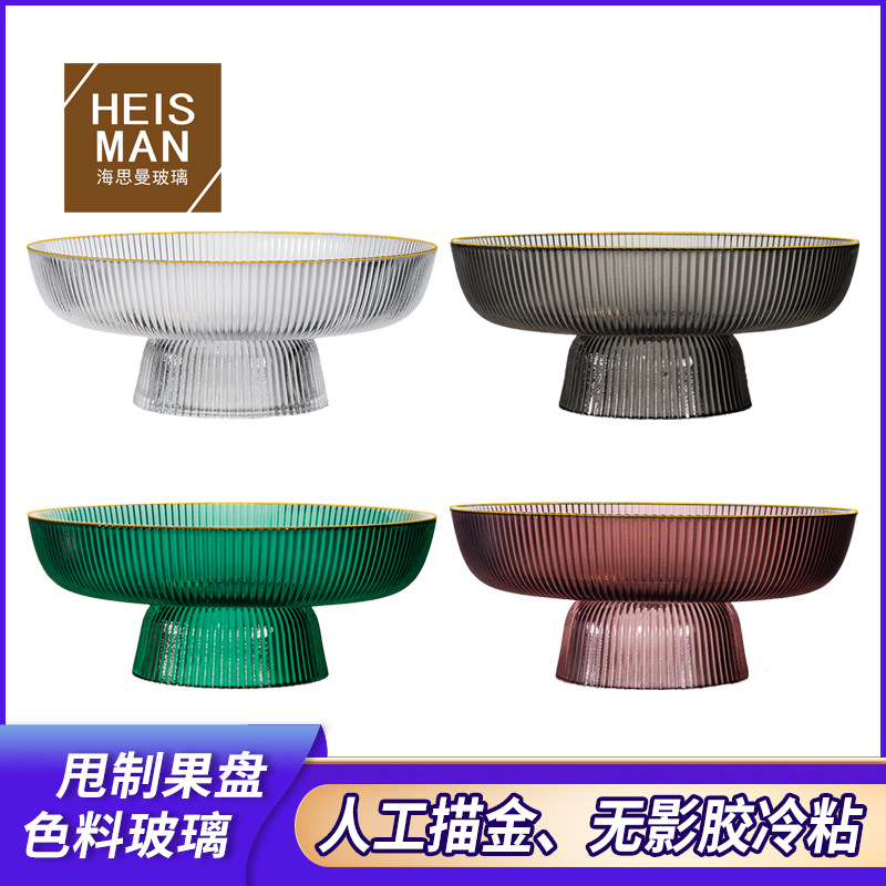 人工投げガラス果物皿縦紋色料トレイ家庭用大容量果物皿金辺高脚収納卸売り