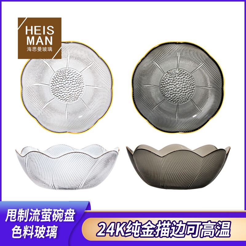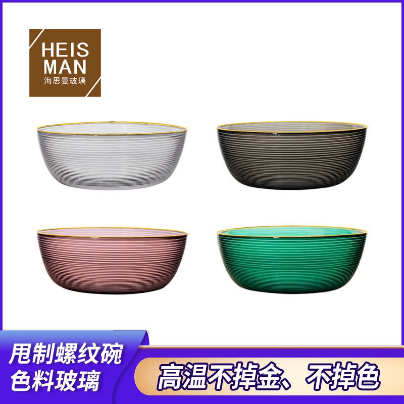 カスタム卸売りカラーガラスボウル創意ねじ食器家庭用金辺サラダボウル丸皿耐熱容器