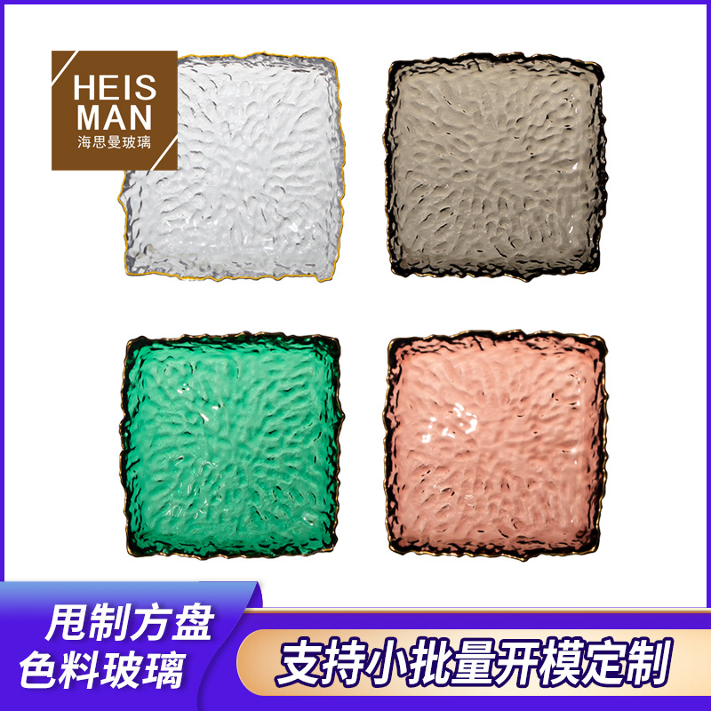 人工的に着色ガラスの四角い皿を振って、金の縁の氷の露の食事の皿の創意的な間食の皿の果物の皿の卸売りは注文します。