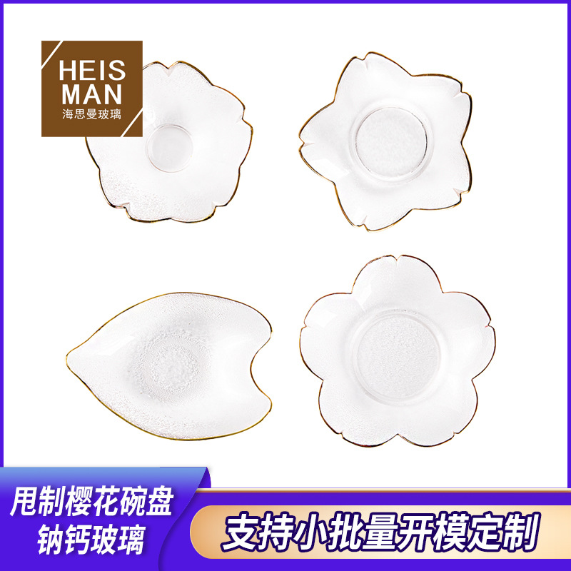 日本式の桜の金の辺の碗の皿は人工的にガラスの皿の家庭の間食の軽食を投げて皿のデザートの食器をつけて卸売りします。