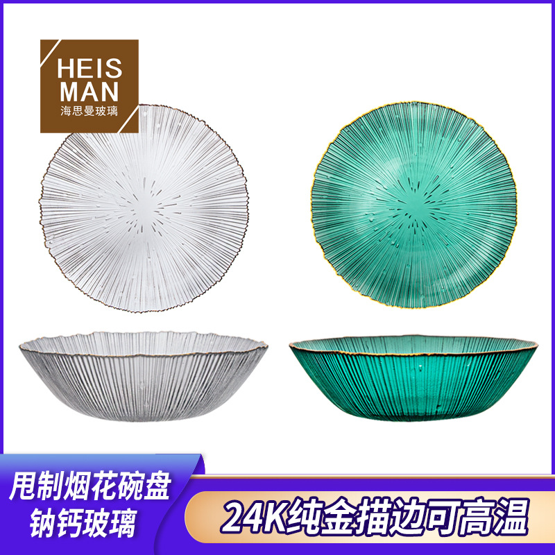 創意的な花火のガラスの碗の皿の色の材料の金の縁の甘いもののサラダの碗の家庭用の食事の皿の見本の間で飾って卸売りを作ります。
