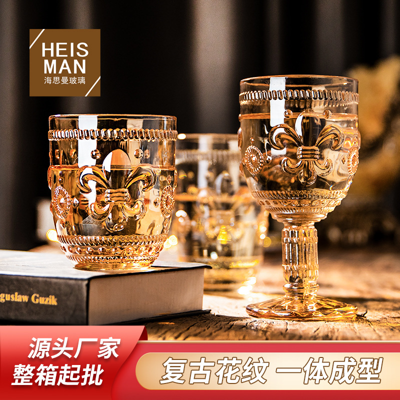 北欧レトロレリーフグラス円形ユリ水杯家庭用金辺ジュースカップアイリス高脚グラス