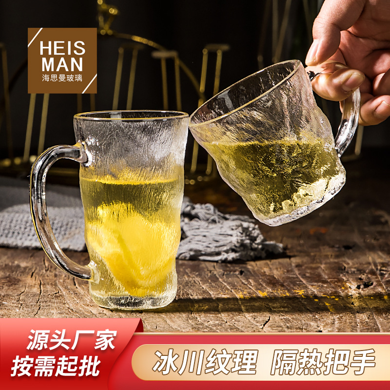日式冰川纹理手把杯加厚透明玻璃杯ins树皮纹水杯早餐杯杯子批发
