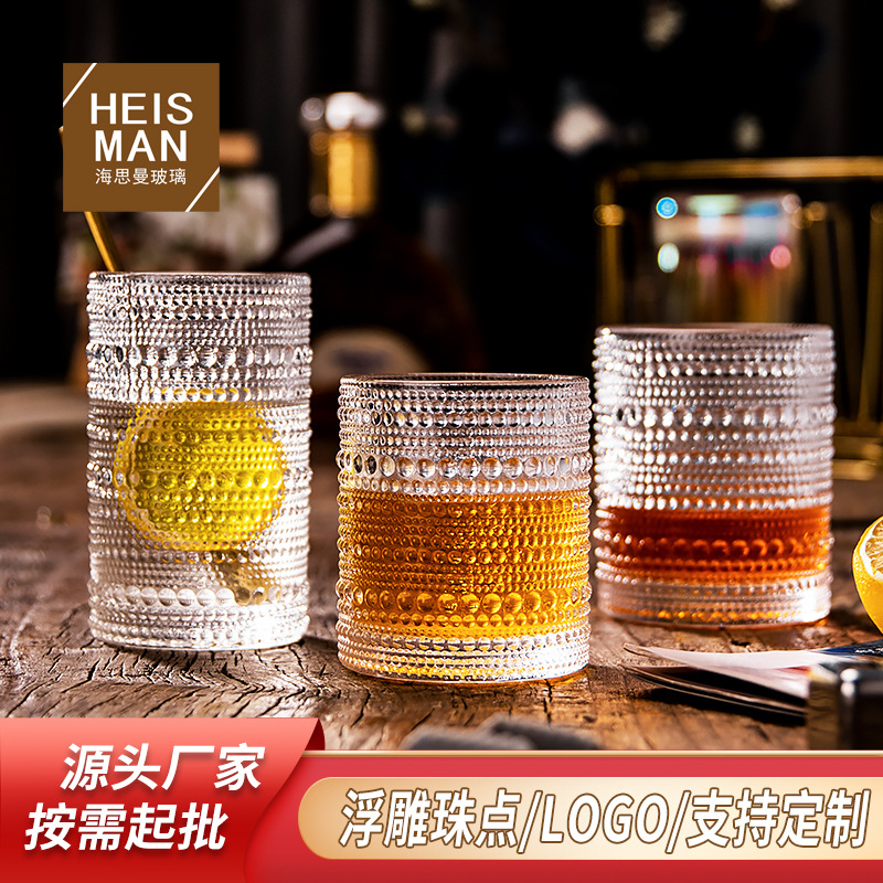 ヨーロピアンスタイルの浮き彫りビーズ模様ガラスカップ、レトロな丸型カップ、冷たい飲み物用カップ、ジュースカップ、ティーカップ、ホリデーギフト