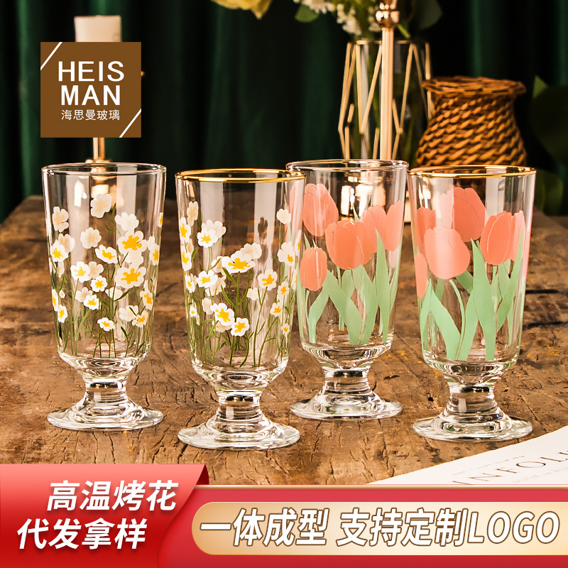 背の高いデカールガラスカップ、デイジージュースカップ、チューリップ金縁ウォーターカップ、朝食カップ、ロゴ入り、高温耐性