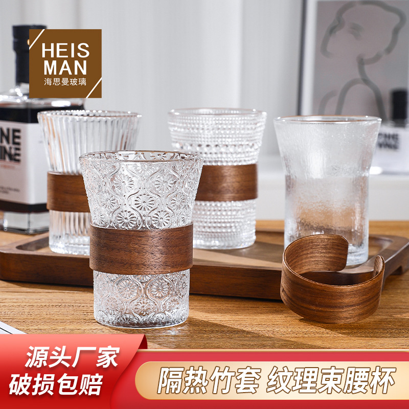 中国式のレトロなガラスのコップの縦の紋様のグラスのオルガンは腰を束ねて手の贈り物の杯の牛乳のジュースの断熱の杯の通用します。
