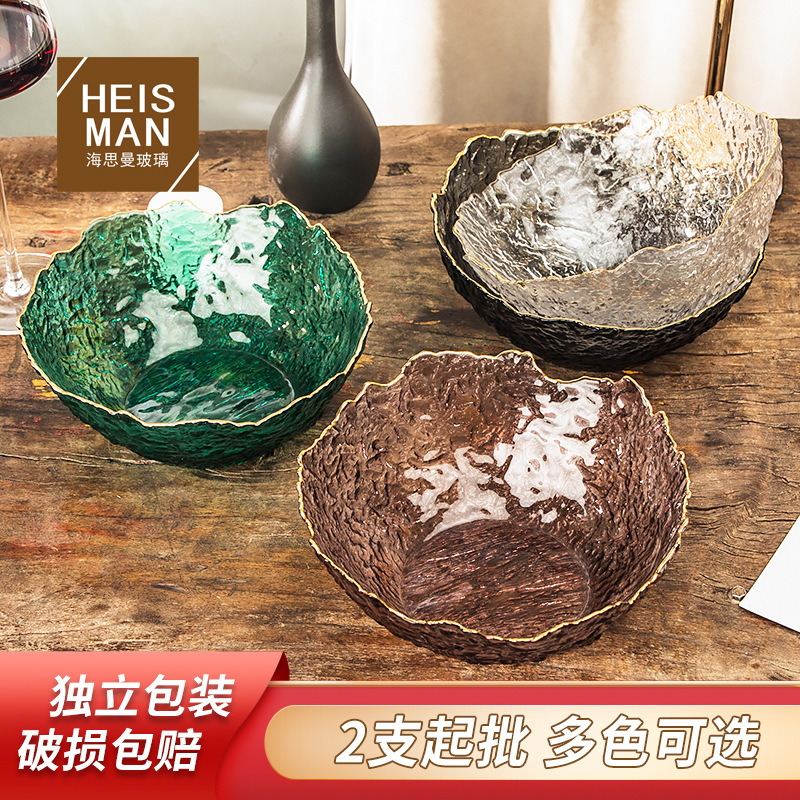 創意的な樹皮の紋様の不規則なサラダの碗の大きいサイズの金辺のガラスの碗の家庭用の果物の碗の皿の異形の耐熱の食器