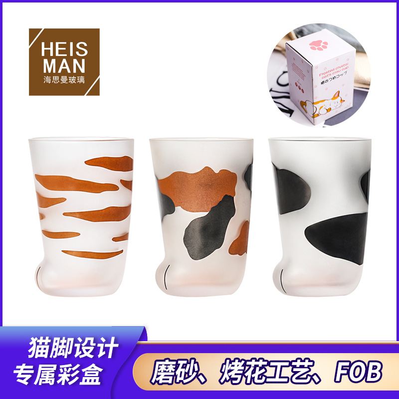 日本式動物水晶グラス艶消し猫足カップ高温焼き花猫爪カッププリント牛乳カップカスタム卸売り