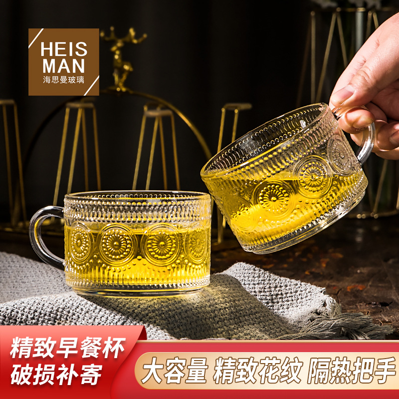 ヨーロピアンスタイルの機械製ハンドルガラスカップ、高温耐性レトロウォーターカップ、家庭用ミルクオートミールカップ、エンボス加工平底朝食カップ
