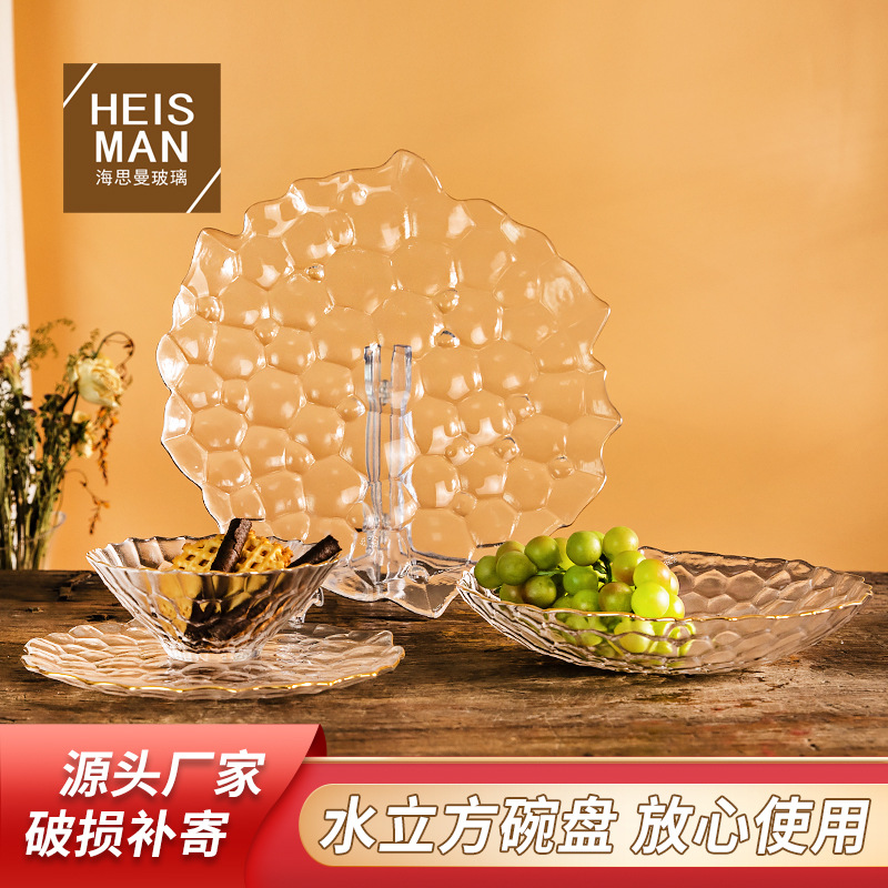 ガラスクリエイティブサラダボウル家庭用透明プノンペンアイスパターン回転金塗装花びら食器セット卸売