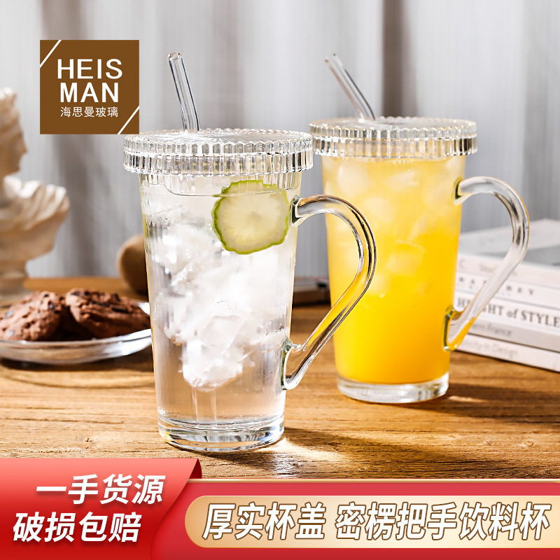 海思曼高颜値ストローハンドルカップ縦紋グラスins風密縁ジュースカップ蓋付き飲料カップ