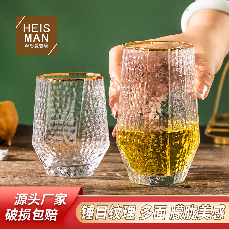 軽量高級透明金縁ウォーターカップ家庭用高温耐性クリスタルガラスカップ不規則なハンマーパターン八角カップ