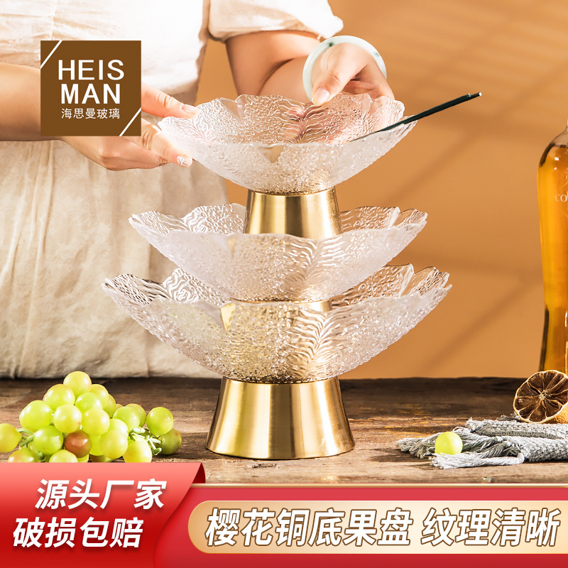 海思曼軽豪華高脚ガラス果盤銅底糖果盤客間間食収納透明桜ハンマー飾り