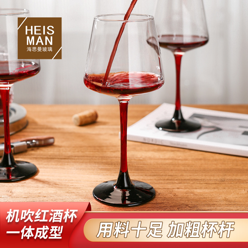 海思曼は勃開地の高足杯の赤い竿の黒い底のワイングラスの家庭用水晶ガラスのワイングラスの卸売りをリードします。