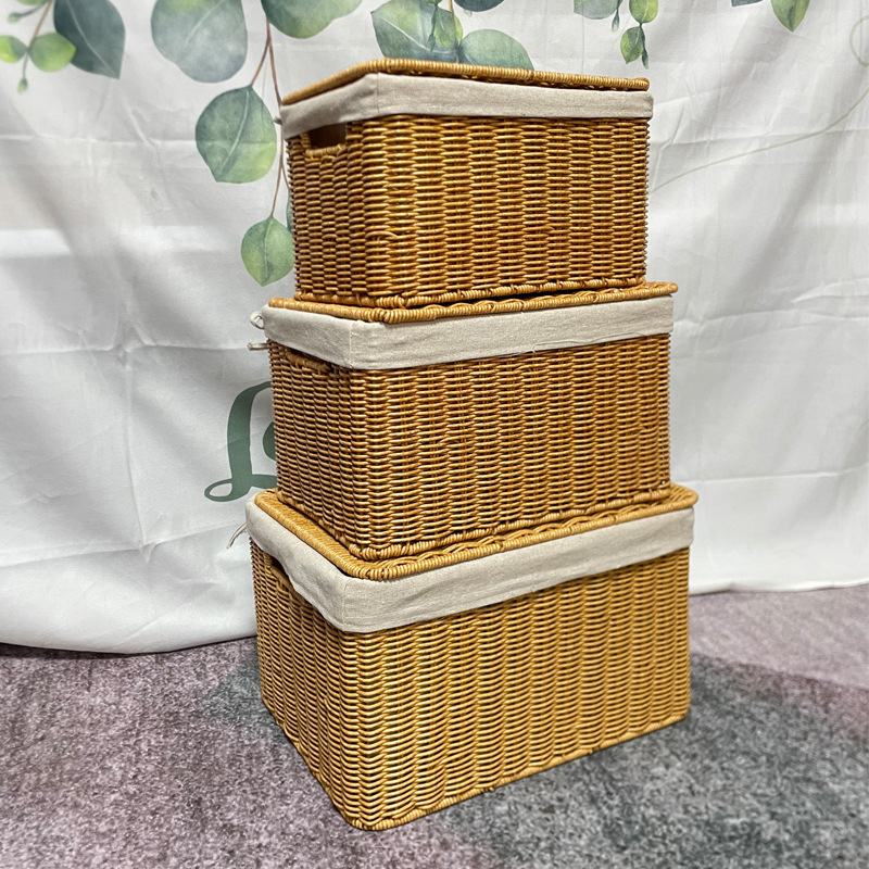 Sn 17純粋な手作りの籐編みの蓋付きの3点セットの双耳汚い服のかごの家の衣類のおもちゃの本の収納かご