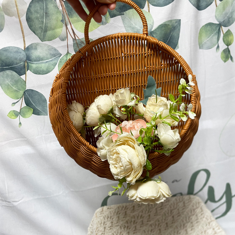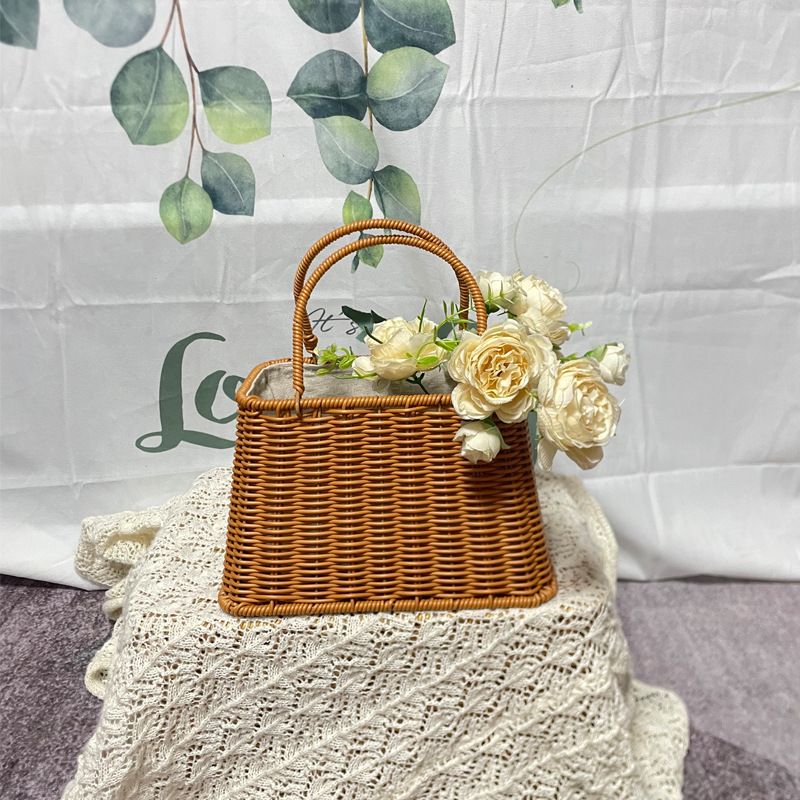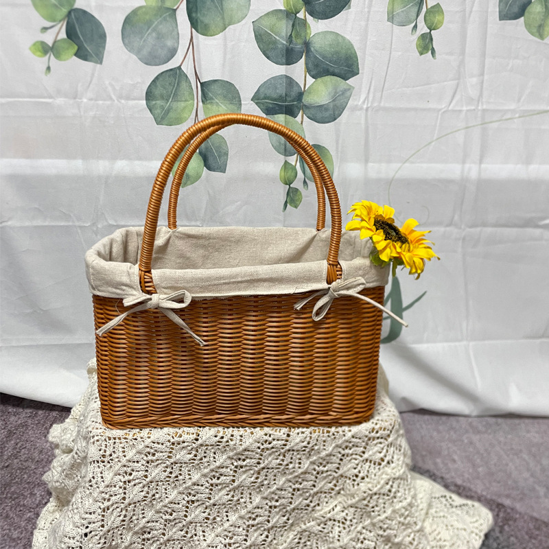 プラスチックの手提げ編みかご屋外ピクニック編みかごレトロ籐編みかご野菜果物模造籐編み収納かご