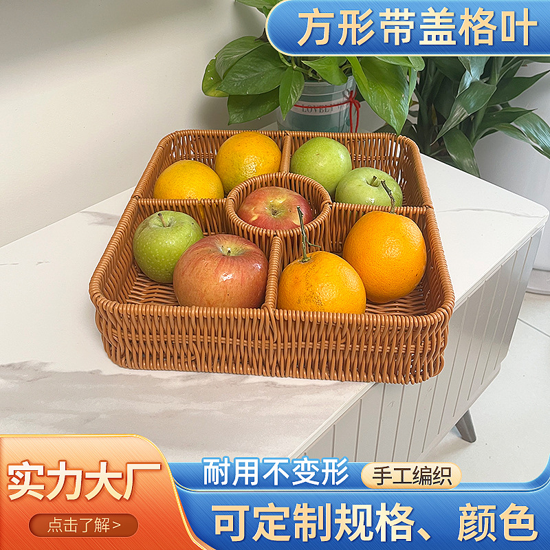 四角い蓋付き葉家庭用レトロ模造藤果籠果物皿間食収納手編みプラスチック果皿