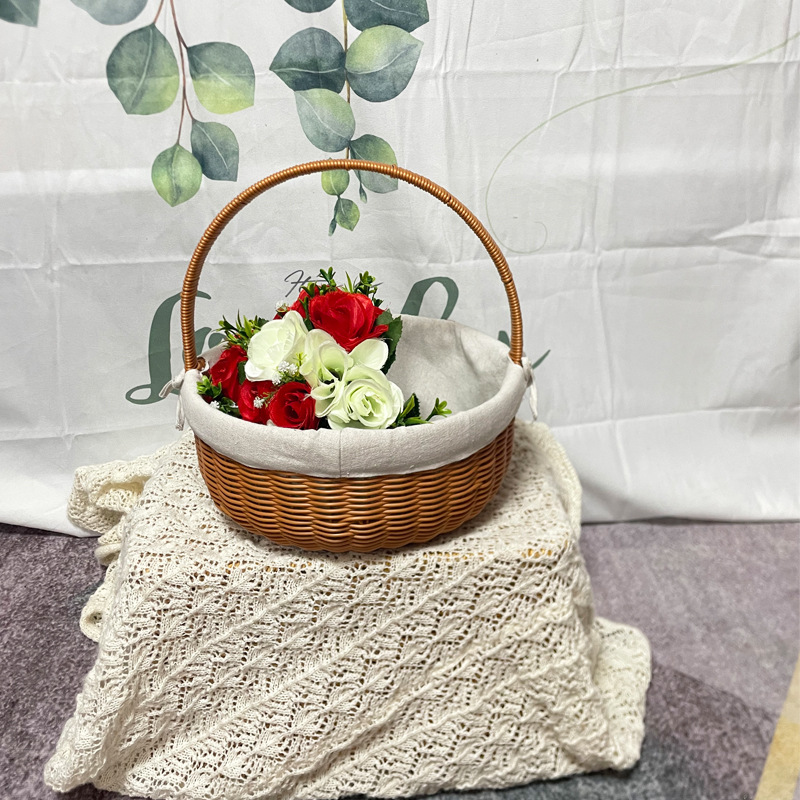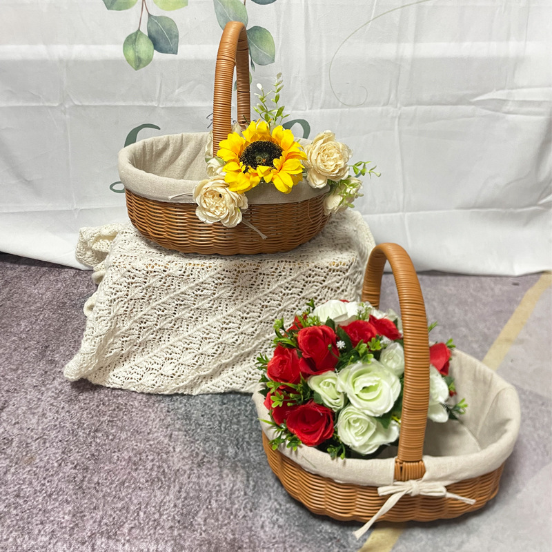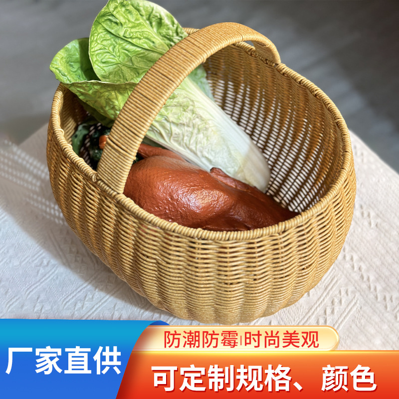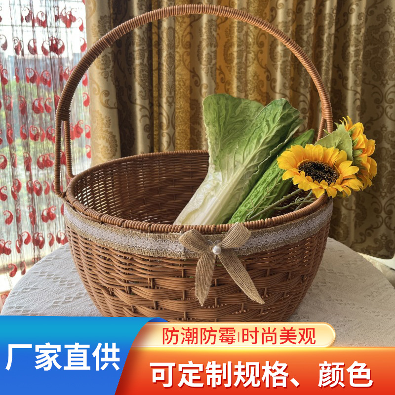 プラスチックの手提げ編みかご屋外ピクニック編みかごレトロ籐編みかご野菜果物模造籐編み収納かご