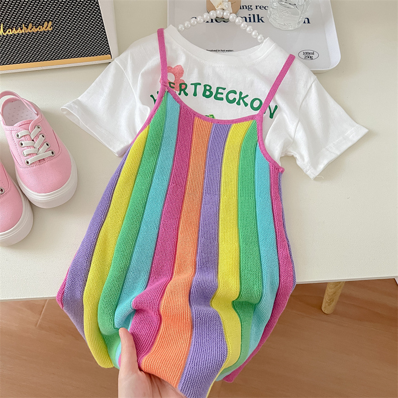 韓国子供服 女の子 夏 2025年新作 おしゃれ レインボーパターン サスペンダースカート 女の子 おしゃれTシャツ+ワンピース