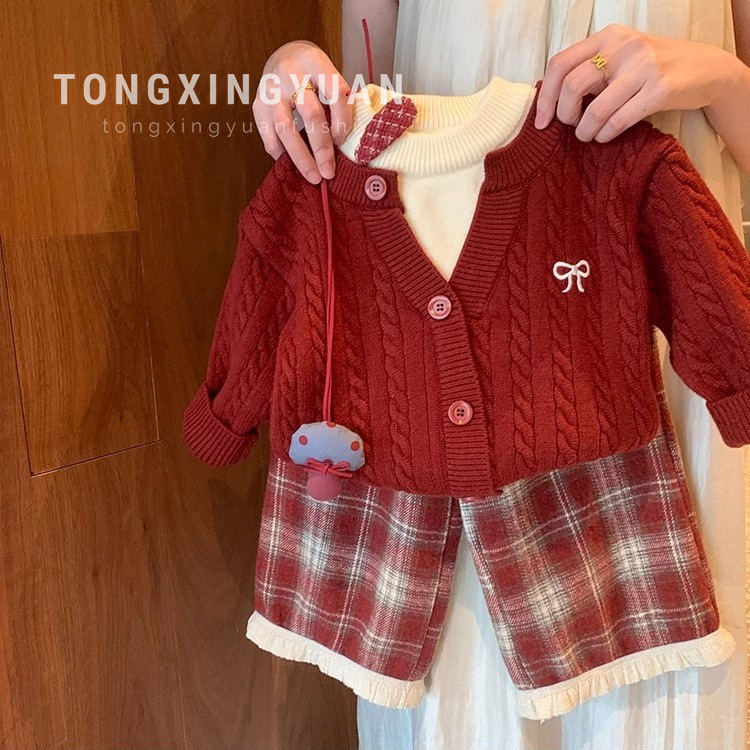 子供用女の子向けフェイクツーピースセーター、カレッジスタイル、2025年秋冬新作、女児ニットセーターセット