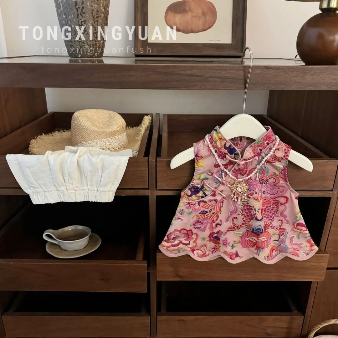 【童星円】吉運錦鯉! 女の赤ちゃんの新しい中国風のチャイナドレスのベストの広い足のズボンの洋風のスーツの潮