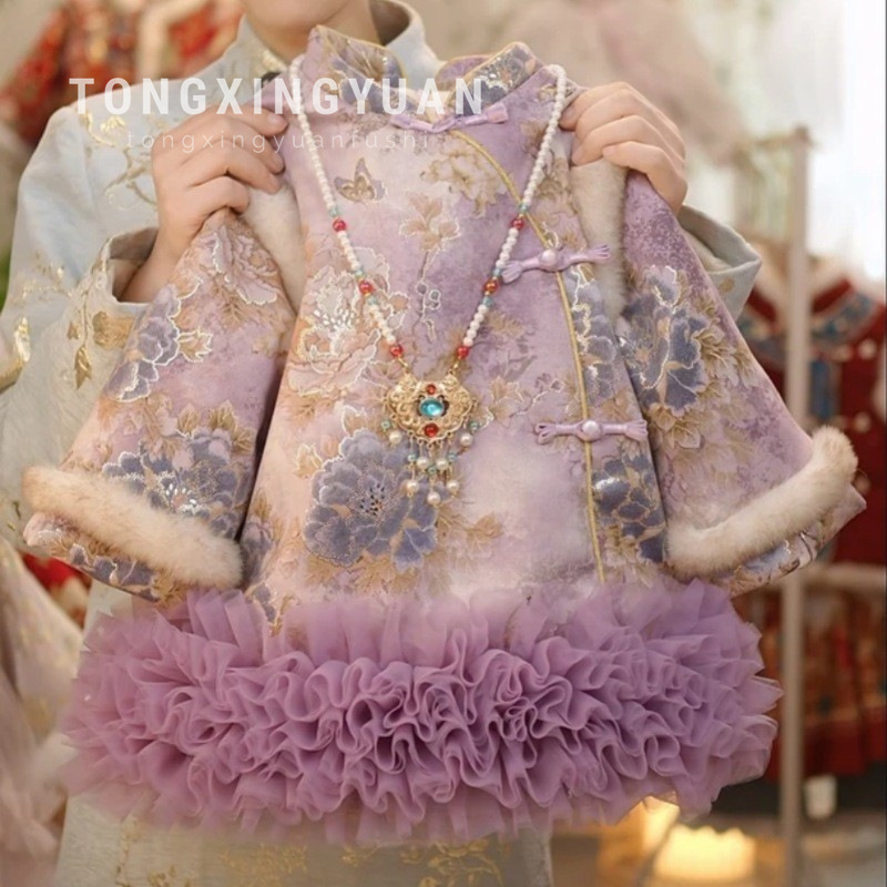 【紫衣】童星円女児冬ベルベット綿旗ガウンスカート子供歳ドレス新中国式新年服