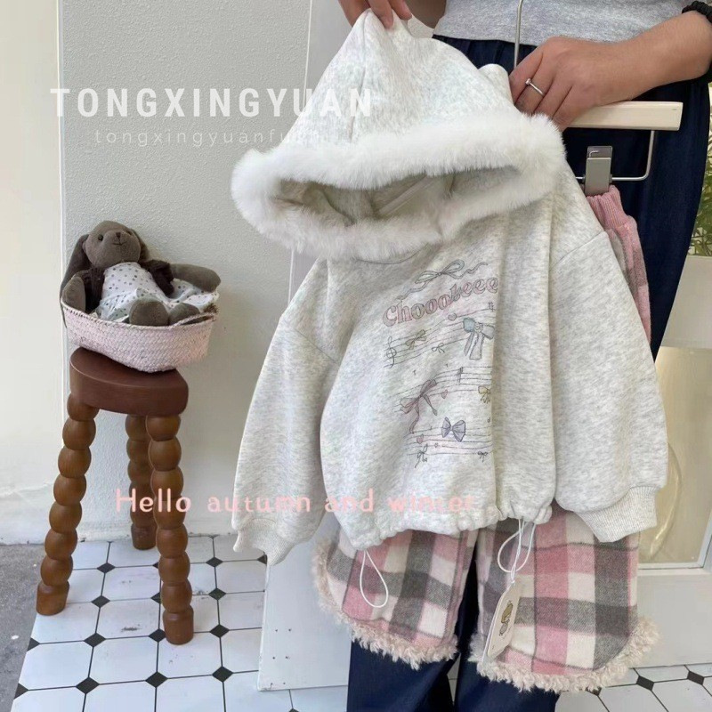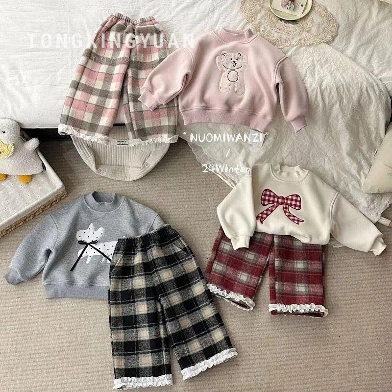 韓国の子供服2024秋冬の女の子の灰色のベルベットの服のスーツの女性の赤ちゃんの秋の格子のカジュアルなズボンのファッション