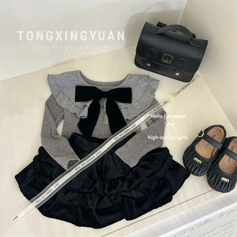 子供用女の子スーツ2025秋新作ベビー韓国風リボン付きパンプキンスカートカレッジ風トップス流行