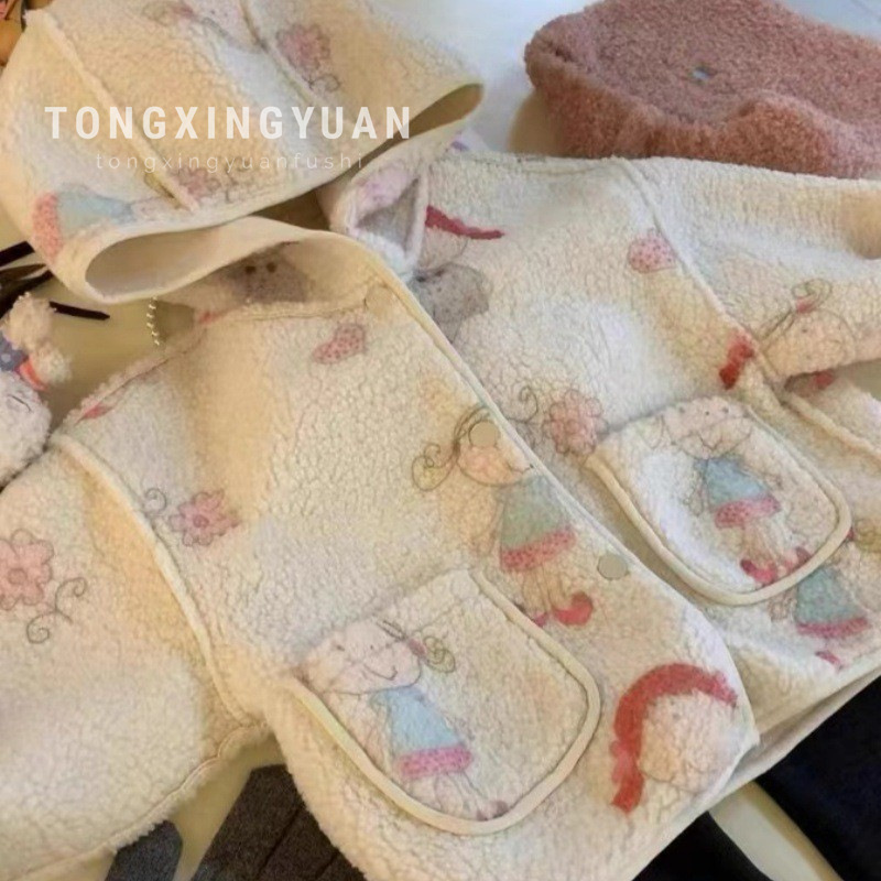 子供の星円の女の子の秋冬のタイプの韓国系の新型の洋気の女性の赤ちゃんの漫画のセーターの子供の子羊の絨毯の帽子の上着