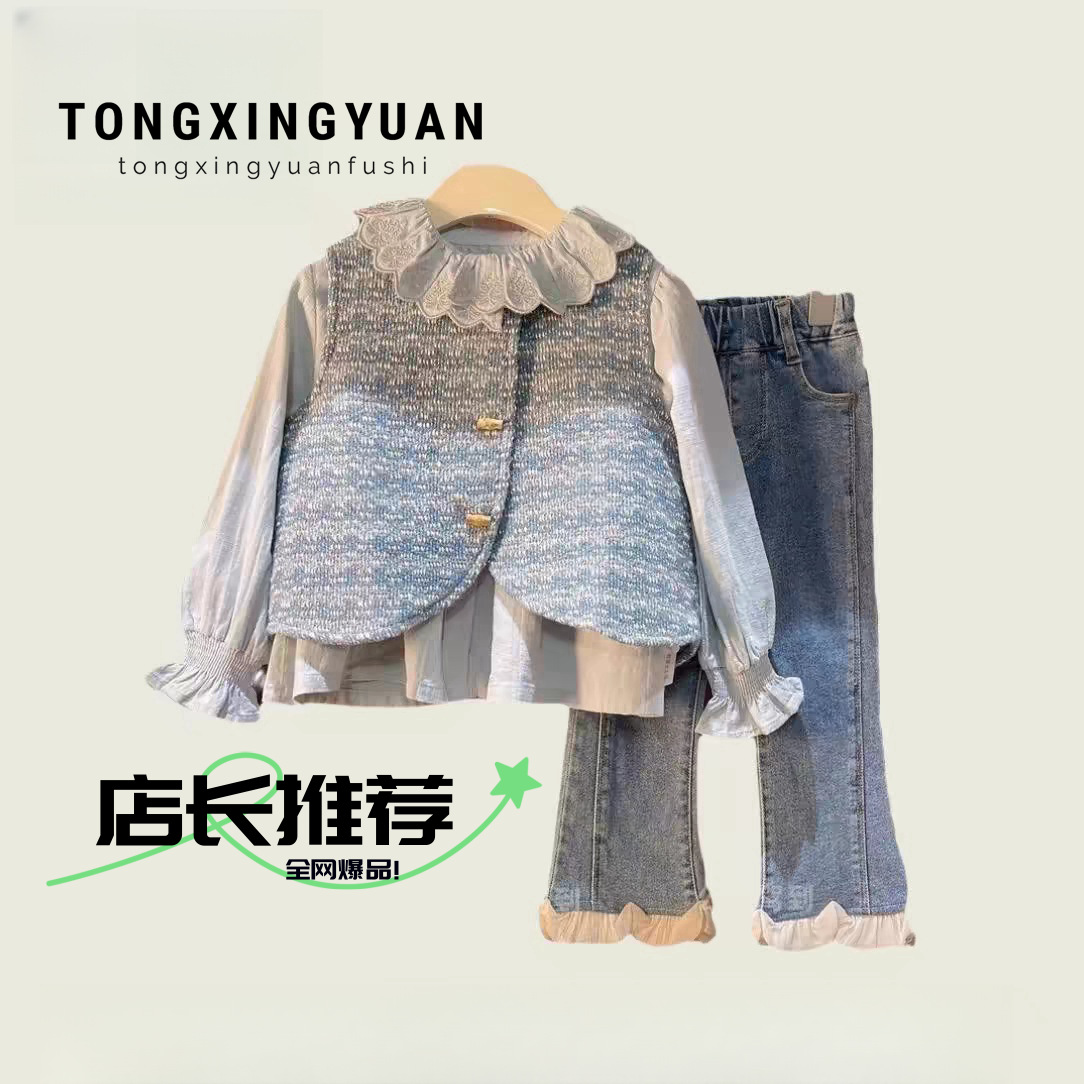 女の子スーツ秋服韓国版おしゃれな子供服女の子ベストシャツファッションジーンズ三点セットファッション